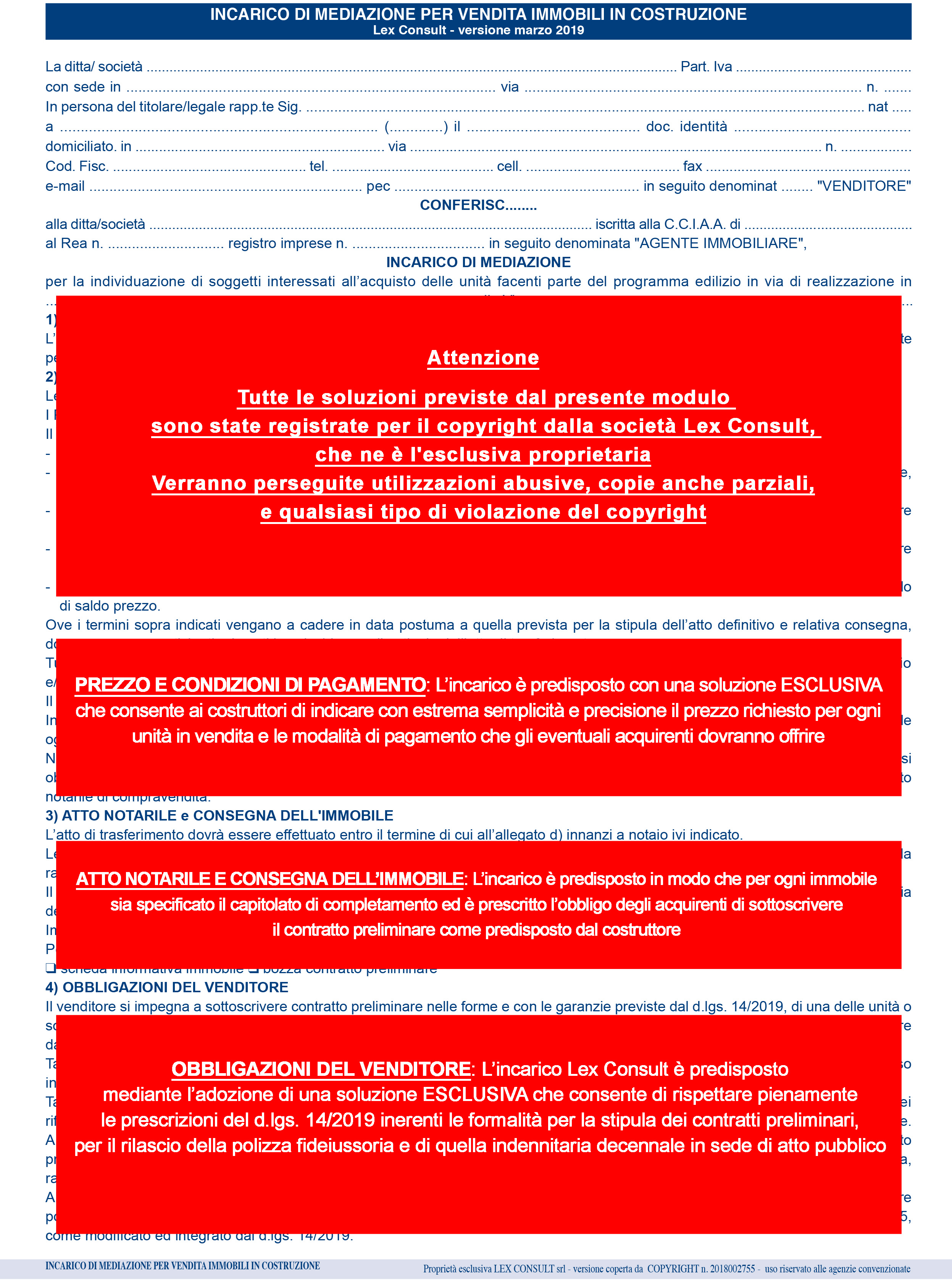 Nuovo incarico di mediazione per vendita immobile da costruire - versione ufficiale Lex Consult predisposto alla luce di tutte le esperienze giudiziarie e consulenziali in materia di mediazione e locazione immobiliare gestite dagli avvocati e consulenti Lex Consult - ULTIMA VERSIONE - si tratta di un modulo rivoluzionario in quanto adottato da Lex Consult e da pochissimi operatori del settore - Lex Consult ha creato un apposito incarico per la vendita degli immobili in costruzione adeguato all’ultima riforma del settore. Mediante la sottoscrizione di questo incarico il costruttore incarica l’agenzia di individuare clienti interessati ad acquistare l’immobile che sta costruendo con la previsione che il contratto preliminare verrà sottoscritto nel pieno rispetto delle previsioni di legge; l’incarico è predisposto sia per l’ipotesi di durata fissa sia per quella di rinnovo automatico, con clausola appositamente strutturata; l’incarico è predisposto per tutelare al massimo il diritto del mediatore alle provvigioni, che possono essere pattuite sia in misura percentuale che in misura fissa. L’incarico, inoltre, prevede l’obbligo di versare la provvigione anche nel caso in cui l’affare si concluda dopo la scadenza. È previsto, inoltre, rimborso spese a favore del mediatore; nell’incarico Lex Consult è prevista la possibilità che possa essere conferito sia in esclusiva che in non esclusiva, con un regolamento estremamente particolareggiato per entrambe le ipotesi ed una soluzione che conferisce possibilità di scelta al sottoscrittore.- Il modulo è coperto da copyright e si vende esclusivamente con il set completo modulistica essenziale vendita immobile in costruzione. Il prezzo si riferisce al set. Per ottenerlo bisogna scaricare la richiesta di licenza d'uso ed inviarla, dopo averla compilata, firmata e timbrata, a mezzo PEC al seguente indirizzo: lexconsult@pec.tuttopec.it -- PER OGNI INFORMAZIONE E PER L'ACQUISTO CONTATTARE IL N. 3456047829€ 2.400,00 -